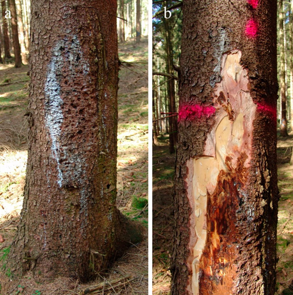 Terhonen, E., Langer, G., Bußkamp, J., Rӑscuţoi, D., & Blumenstein, K. 2019. Resin flow on the stem is one of the symptoms that indicates the possible infection of H. annosum s.l. Living Norway spruce, confirmed to be infected by Heterobasidion annosum s.l. [Photograph]. Forests.