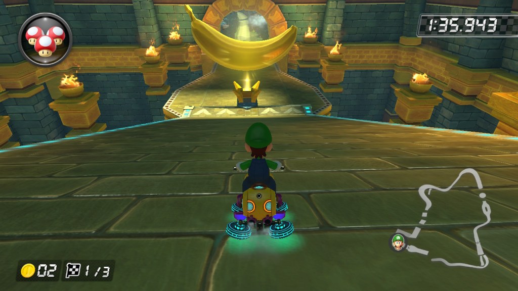 For example, he has needlessly erected a large banana shrine in the middle of the racetrack, thus partially obstructing vehicular access to the rest of DK Jungle.